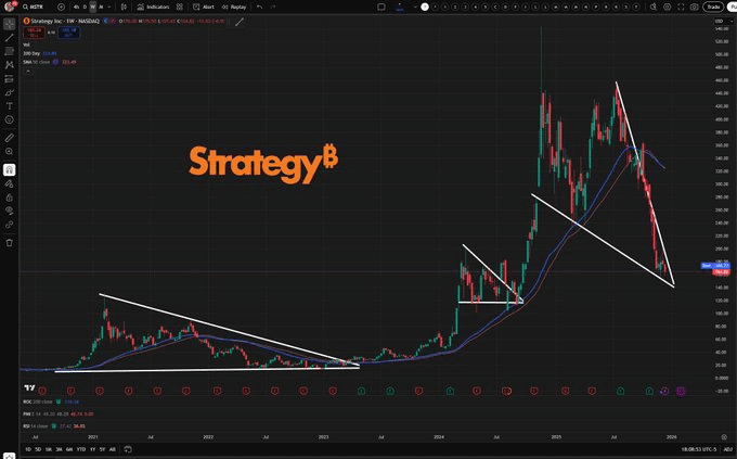 MicroStrategy price structure reflects repeated cycles of contraction before directional resolution. Long-term charts show price compressing into declining formations ahead of strong expansions. This behavior has remained consistent across multiple market cycles.