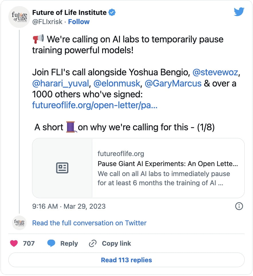 “This pause should be public and verifiable, and include all key actors. If such a pause cannot be enacted quickly, governments should step in and institute a moratorium,” it wrote.