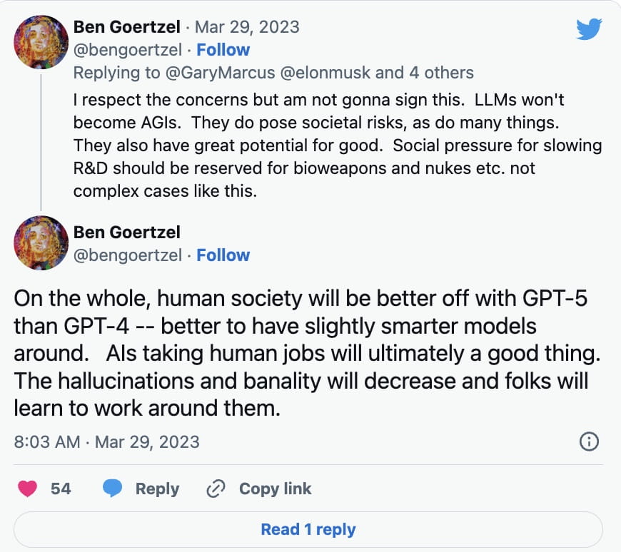 Not all AI pundits have rushed to sign the petition though. Ben Goertzel, the CEO of SingularityNET explained in a March 29 Twitter response to Gary Marcus, the author of Rebooting.AI that language learning models (LLMs) won’t become AGIs, which, to date, there have been few developments of.
