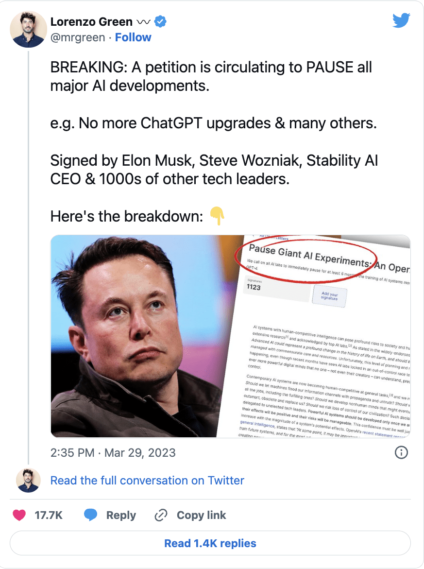The institute called on all AI companies to “immediately pause” training AI systems that are more powerful than GPT-4 for at least six months, sharing concerns that “human-competitive intelligence can pose profound risks to society and humanity,” among other things:
