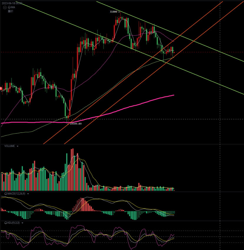 🕐日线来看,持续震荡下跌,均线(正常均线)空头排列未能看到上涨迹象,周K上的延续持续发力之后势必会给价格带来新的一次探底,整体趋势上日线压力位已经来到27000一线,