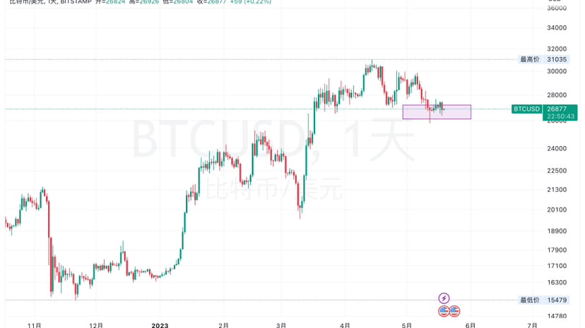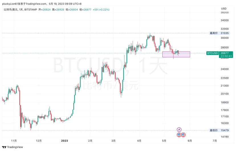 当前的行情虽然不存在周线级别的调整,但日线级别的调整可能仍然是存在的,我们这周开始关注的27500-700关键压力位始终未能站上突破,昨日试探之后继续又回到27000下方,短期面临选择。