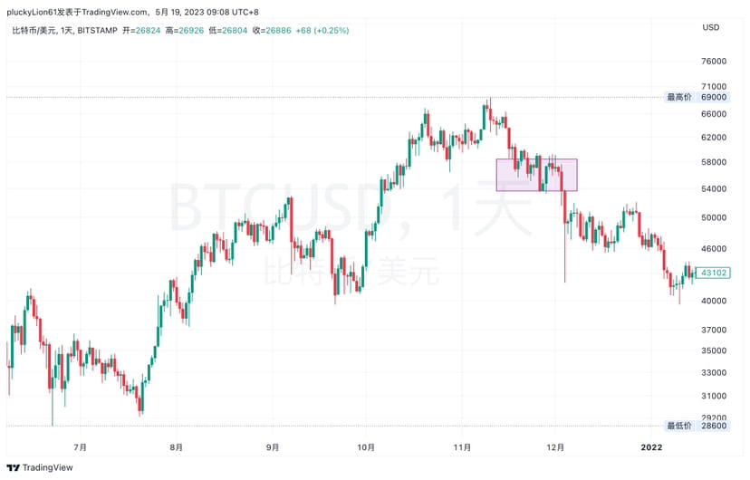 21年那次我记得当时大饼也是在浪型顶部出现了日线高点,并且我们当时还提到如果行情继续走弱,不能站上5.8w,将进入周线级别的长期调整,后来大家也知道,2022年全年走弱调整至1.5w。
