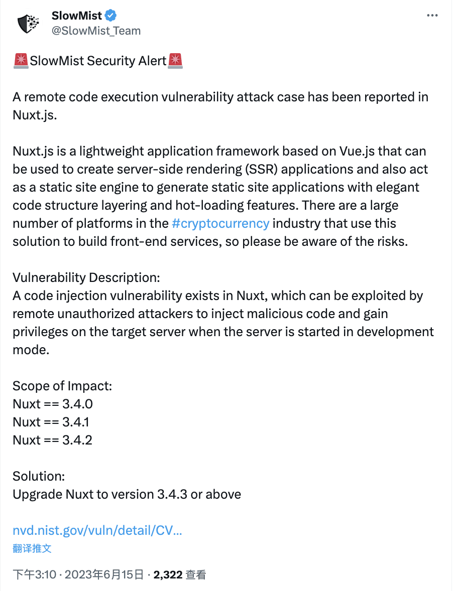 Nuxt 中存在代码注入漏洞,当服务端以开发模式启动时,远程未授权攻击者可利用此漏洞注入恶意代码并获取目标服务器权限。其中,Nuxt == 3.4.0,Nuxt == 3.4.1,Nuxt == 3.4.2 均受到影响。推文中提到,加密货币行业有大量平台采用此方案构建前后端服务,请注意风险,并将 Nuxt 升级到 3.4.3 或以上版本。