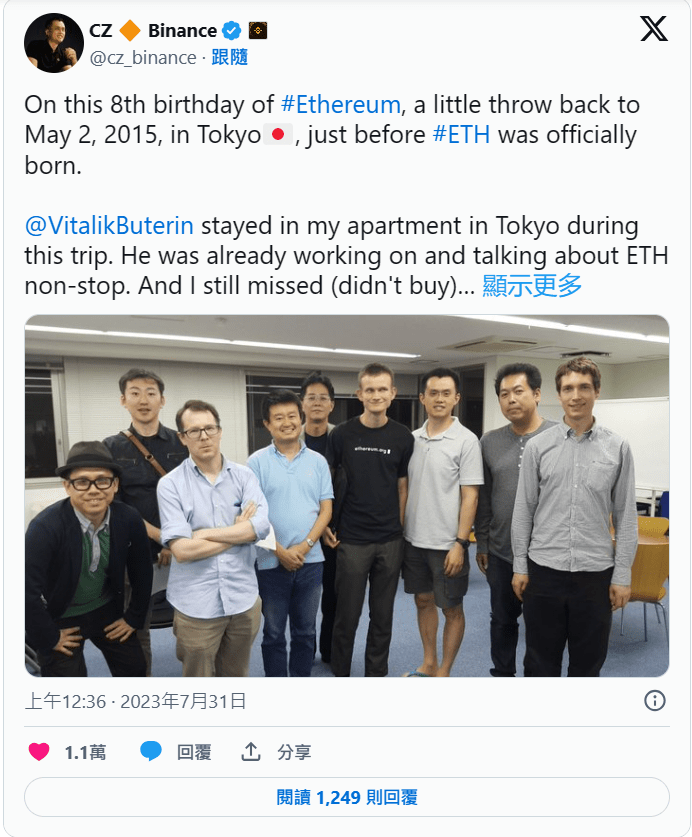 赵长鹏在贴文中打趣道,Vitalik Buterin 那阵子刚好访日并且借住在他位于东京的公寓,虽然当时以太坊尚未正式上线,但 Vitalik Buterin 已经开始不停在研究和谈论以太币(ETH)。 不过,赵长鹏表示他并未因此动摇而购买以太币,却也庆幸自己错失了这个投资机会,否则后来恐怕也就没有动力创办币安了。