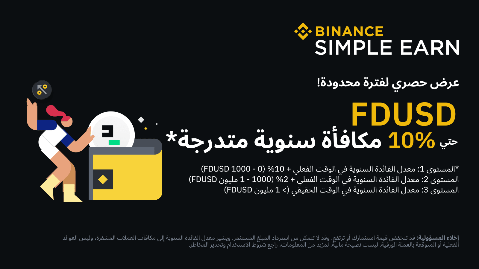 يُسر منصّة Binance Simple Earn إطلاق عرض على مُنتجات Simple Earn المرنة لرموز FDUSD المميزة! أكمِل عمليات اكتتاب FDUSD على مُنتجات Simple Earn المرنة خلال فترة العرض للتمتّع حصريًا بمُعدّل نسبة سنوي إضافي ذي فئات بقيمة تصل إلى 10% علاوةً على مُكافآت مُعدّل النسبة السنوي اللحظي (أي، ما يصل إلى 5%).