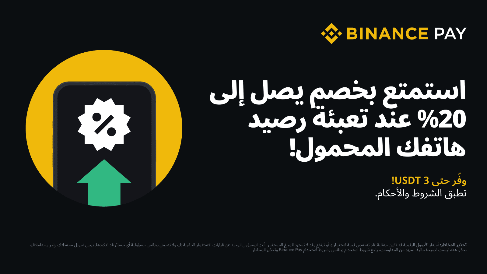 يُسر منصّة Binance Pay الإعلان عن عرض جديد لجميع مُستخدمي Binance Pay، حيث يتمتع المُستخدمون المؤهلون بخصم يصل إلى 20% على عمليات تعبئة الهاتف الجوّال (الحد الأقصى 3 USDT).