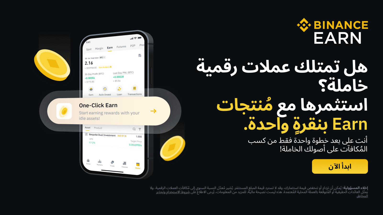 يُنصح المُستخدمون بترقية تطبيق Binance الخاص بهم إلى أحدث إصدار للوصول إلى ميّزة مُنتجات Earn بنقرةٍ واحدة. وسيتم دعم الميّزة على موقع Binance (بينانس) الإلكتروني قريبًا، ولن يتم إصدار إعلان مُنفصل حول ذلك.