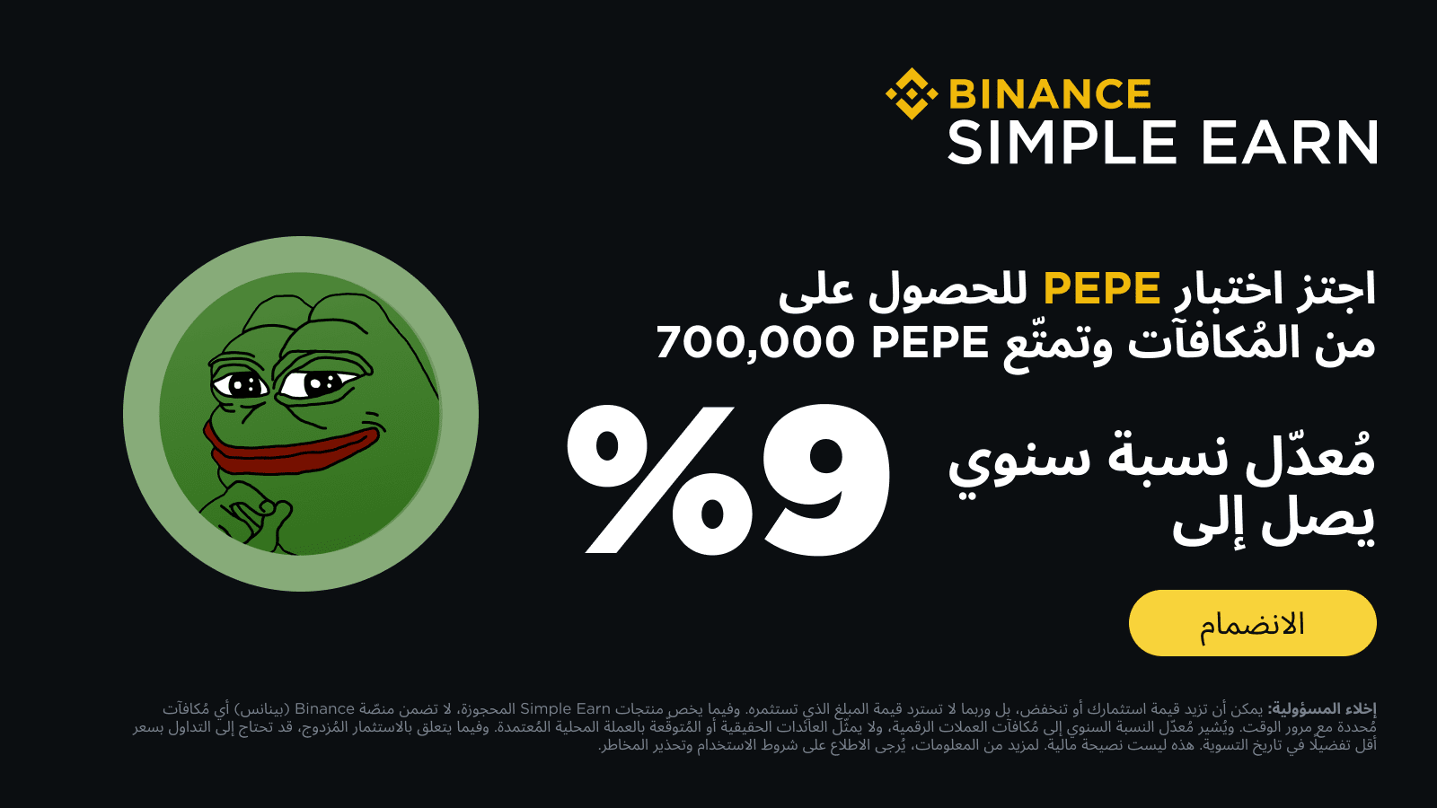 يُسر Binance Simple Earn أن تُطلق عرضين جديدين على PEPE (PEPE)! يُمكن لمُستخدمي مُنتجات Simple Earn المحجوزة الجُدد التعرّف على المزيد حول PEPE وإكمال اختبار خلال فترة العرض للحصول على صفقة مجانية بقيمة 700,000 PEPE على المُنتجات المحجوزة لكل منهم. علاوةً على ذلك، يُمكن للمُستخدمين الاكتتاب أيضًا على مُنتجات Simple Earn المرنة لرموز PEPE خلال فترة العرض للتمتّع بمُعدّل نسبة سنوي إضافي مُتدرّج يصل إلى 9% علاوةً على مُكافآت مُعدّل النسبة السنوي اللحظي.