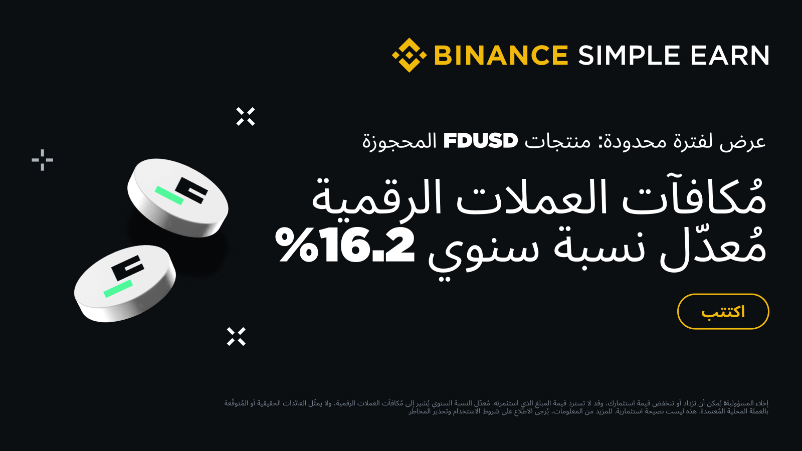 يتم توزيع مُكافآت مُعدّل النسبة السنوي من الأموال الخاصّة بمنصّة Binance (بينانس)، ويتم تحديدها بناءً على تقدير وتقييم ظروف السوق السائدة. هذا العرض غير مُرتبط بمُصدِر رموز FDUSD بأي شكل من الأشكال.