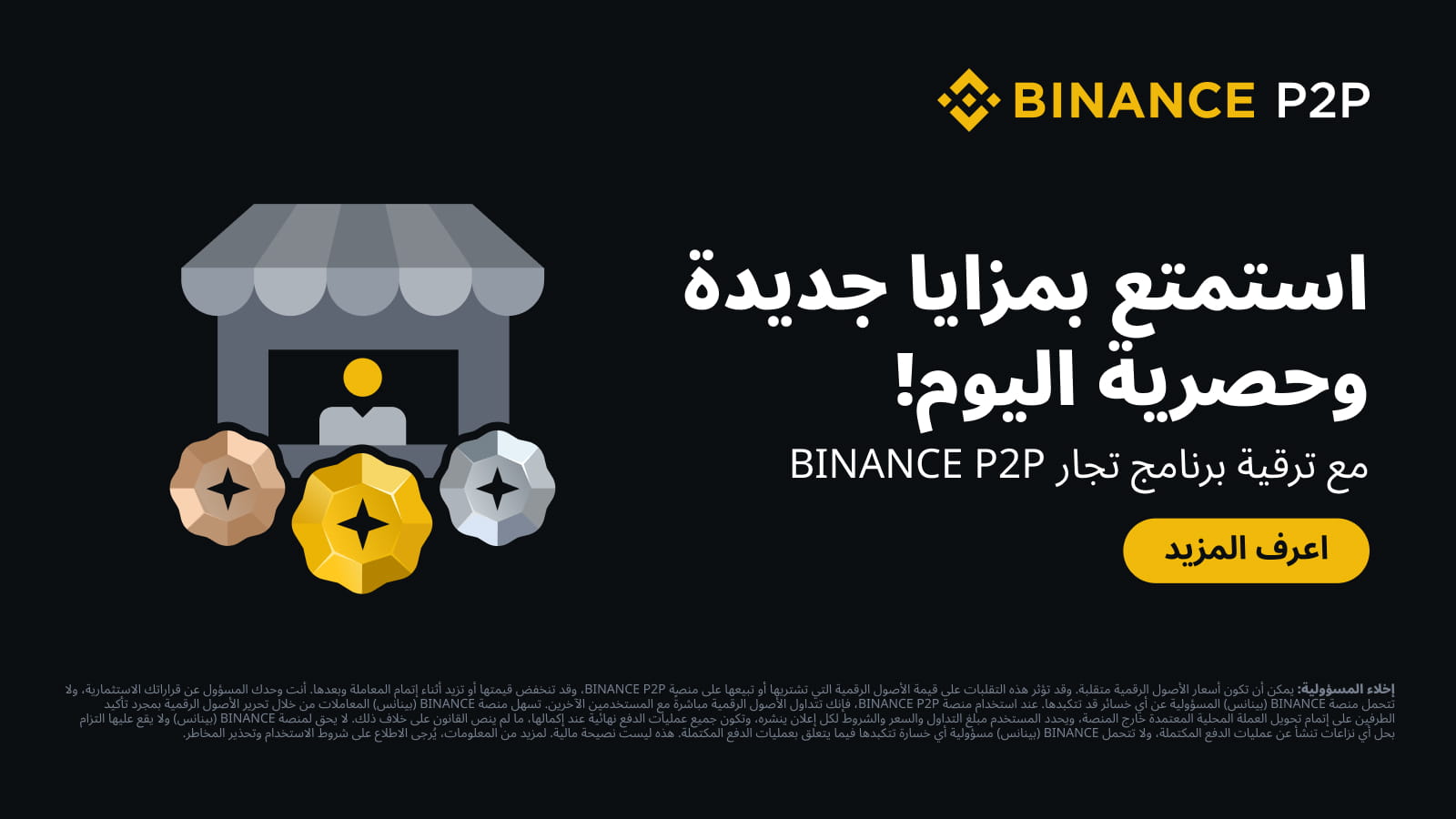 تحذير المخاطر: قد تتعرض الأصول الرقمية لتقلبات الأسعار. وقد تؤثر هذه التقلبات على قيمة الأصول الرقمية التي تقوم بشرائها أو بيعها على منصة Binance P2P، والتي قد تزيد أو تنخفض أثناء إتمام المعاملة أو بعدها. تتحمل وحدك مسؤولية قراراتك الاستثمارية، و Binance (بينانس) ليست مسؤولة عن أي خسائر قد تتكبدها. وباستخدام منصة Binance P2P، فأنت تتداول الأصول الرقمية مع المستخدمين الآخرين مباشرةً. تعمل Binance (بينانس) على تسهيل إجراء المعاملات من خلال تحرير الأصول الرقمية بمجرد تأكيد كلا الطرفين على إتمام تحويل العملة المحلية المعتمدة خارج المنصة. يحدد المستخدم مبلغ التداول وسعر وشروط كل إعلان ينشره. جميع المُعاملات نهائية عند إكمالها ما لم ينص القانون خلافًا لذلك. لا يحق لـ Binance (بينانس) ولا يقع عليها التزام بحل أي نزاعات تنشأ عن عمليات الدفع المكتملة. لن تكون Binance (بينانس) مسؤولة عن أي خسائر قد تتكبدها في ما يتعلق بعمليات الدفع المكتملة. هذه ليست نصيحة مالية. للمزيد من المعلومات، يُرجى الاطلاع على شروط الاستخدام الخاصة بنا وتحذير المخاطر.