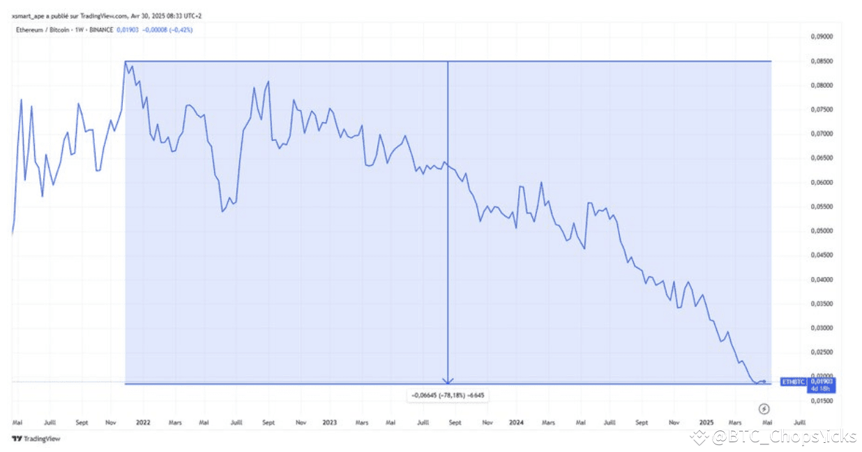 但现实是:ETH自2021年高点以来对BTC贬值超过80%。
