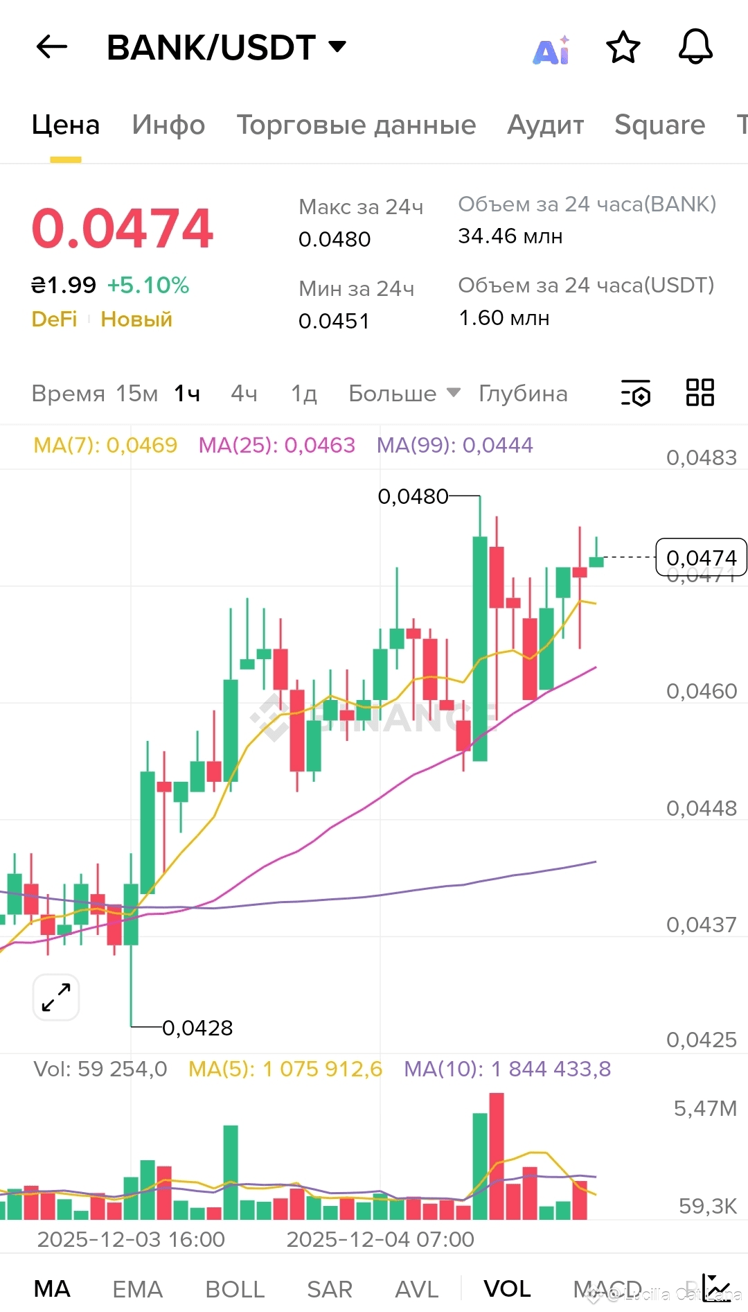 Смотрю на $BANK и вижу +5,10% за сутки. Цена 0,0474, и первая мысль – ну вот, наконец-то движение. Но потом взгляд падает на объемы: 34,46 миллиона BANK за 24 часа. И тут начинается внутренний диалог, который разрывает меня между оптимизмом цифр и реализмом контекста.