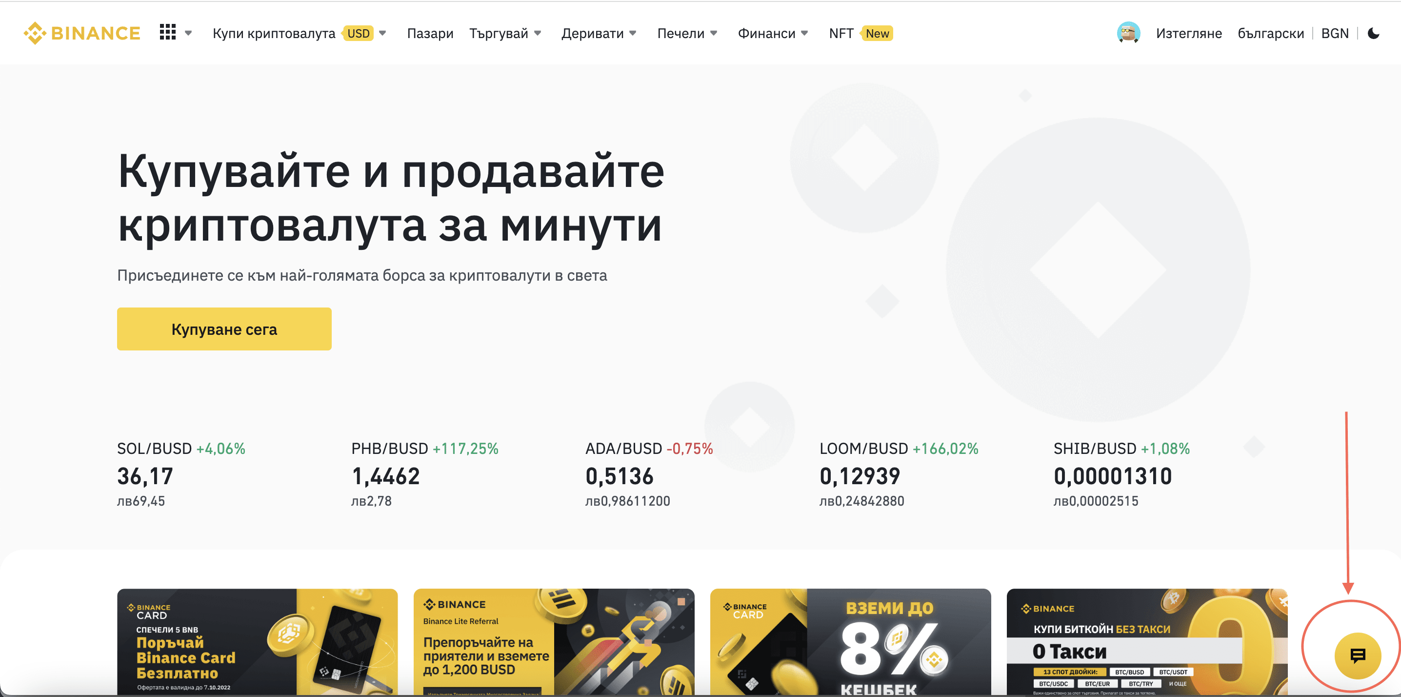 Изберете чат иконката от долния десен ъгъл на екрана ви. Можете да се включите в чата без значение дали сте влезли в профила си или не. Ако не сте влезли в профила си, агентът ще ви помоли да се идентифицирате допълнително.