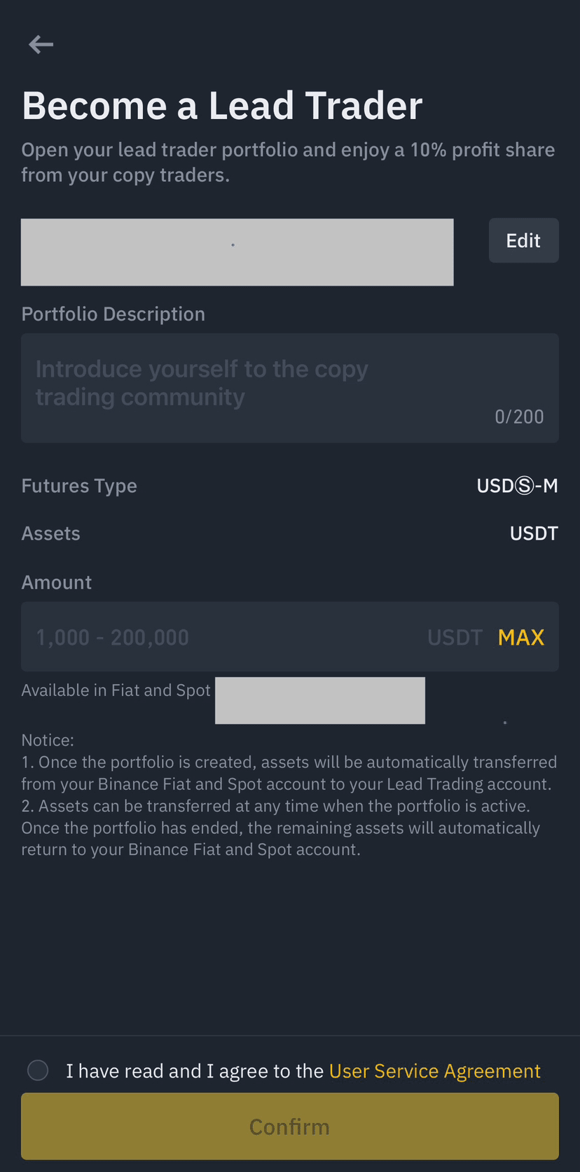 • Amount: Specify the amount you want to use for lead trading (minimum 1,000 USDT). Once your portfolio is created, the funds will be moved from your Spot Wallet to your Lead Trading Account.