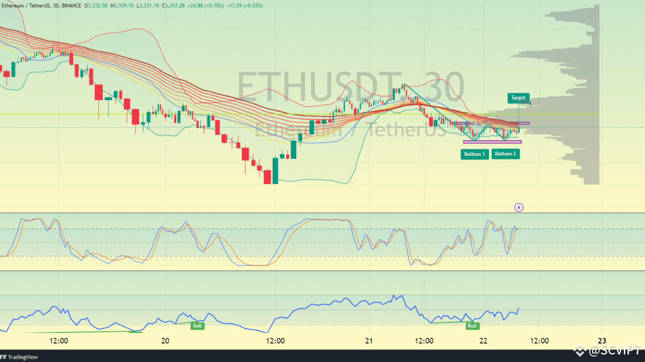 The ETH/USDT 30-minute chart shows a bullish outlook with a confirmed Double Bottom pattern targeting $3,375. EMA ribbons are flipping as support, aligning with upward momentum. RSI at 50 suggests neutral momentum, supporting continuation. Stochastic RSI at 80.48 indicates overbought conditions, suggesting possible minor retracements before further upside. Volume profiles show strong demand near $3,343, reinforcing the bullish setup. This pattern aligns with your long-term bullish perspective on ETH, with recovery gaining strength over time.