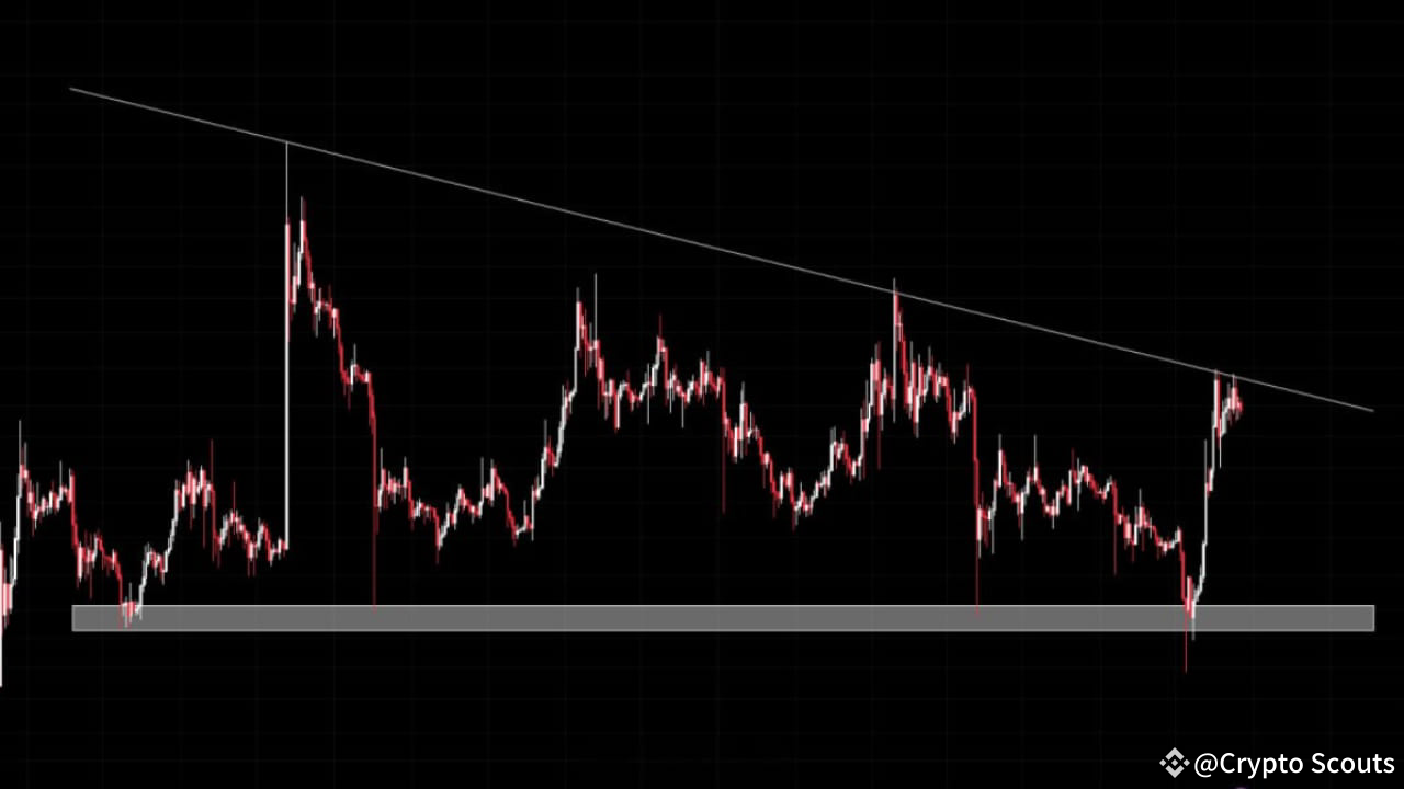 Graf ukazuje klesající trojúhelník, což je obvykle medvědí vzor pokračování. Cena se několikrát pokusila prorazit nad trendovou linii, ale pokaždé narazila na silný odpor. Významnou úrovní zůstává i horizontální support kolem 0,42 USD, který opakovaně držel cenu před poklesem.