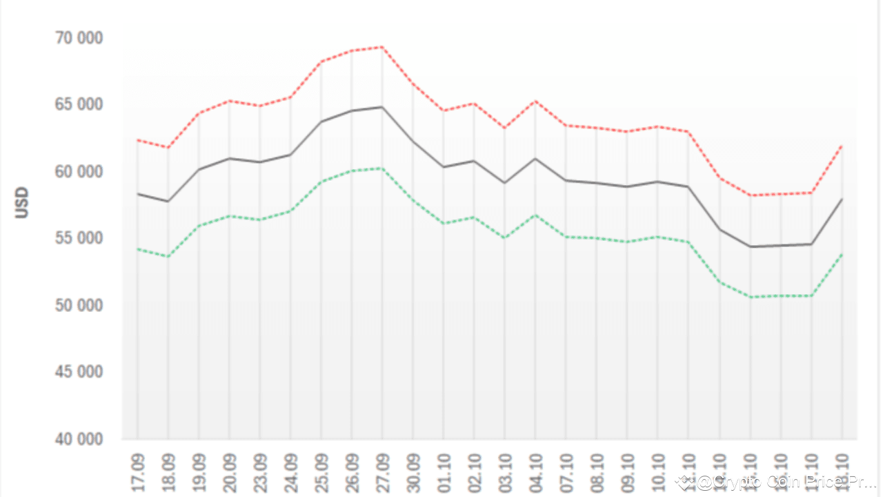 Mezi 17. a 27. zářím zaznamenal Bitcoin výrazný vzestup, který dosáhl vrcholu kolem 65 000 USD. To tvoří zásadní úroveň odporu pro obchodníky. Následně cena začala klesat a 13. října dosáhla minima těsně pod 55 000 USD, což naznačuje silnou úroveň podpory.