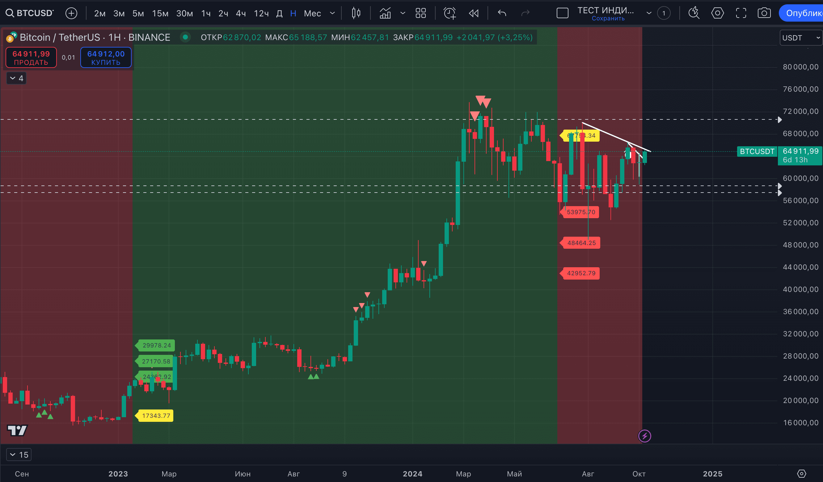 Signál indikátoru vám umožnil na konci ledna 2023 nakoupit#BTCza 23 960 USD a prodat buď při silném signálu potenciálního HIGH na 68 393 USD v březnu 2024, nebo za 55 856 USD při signálu změny trendu v červenci 2024.