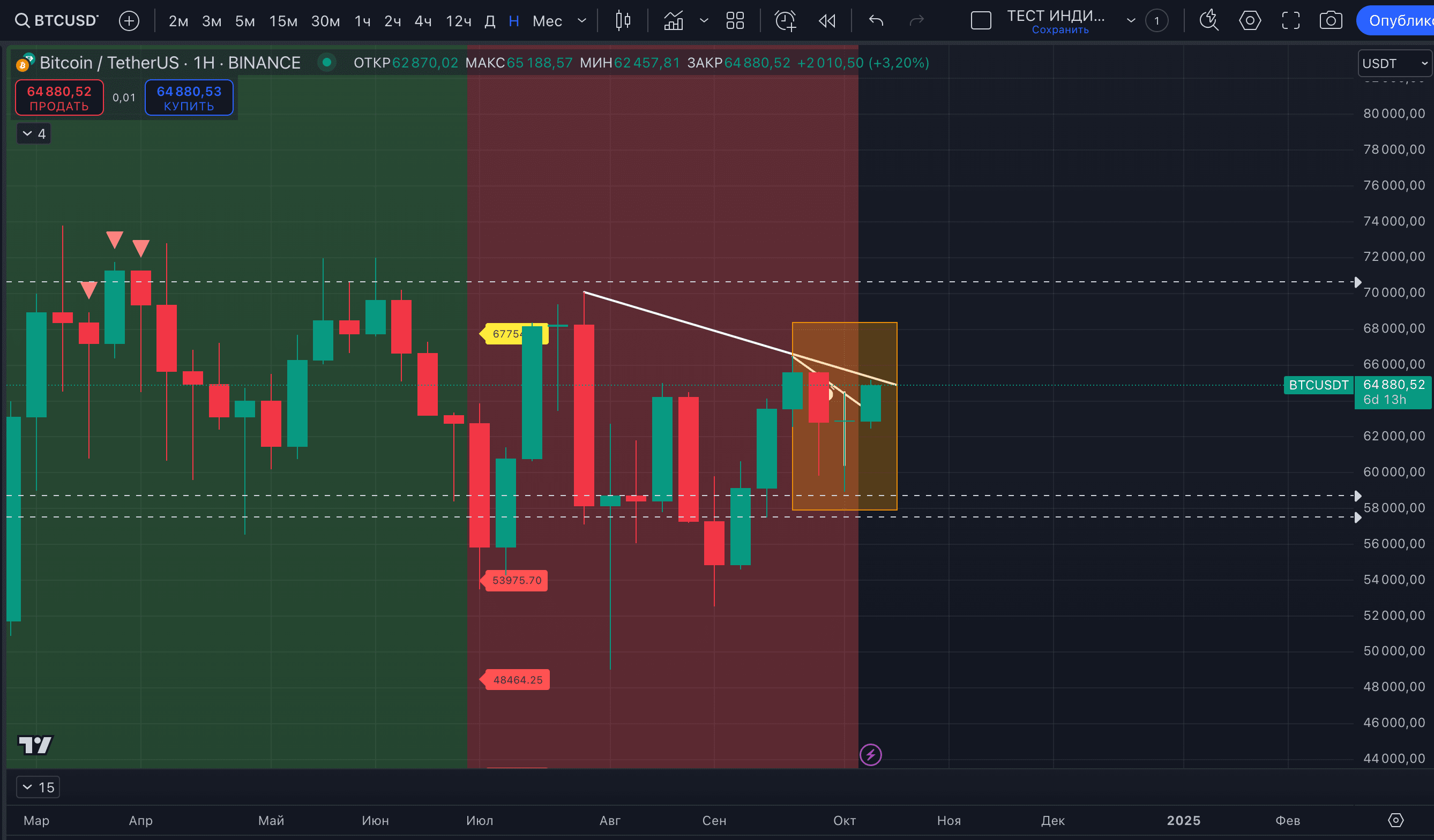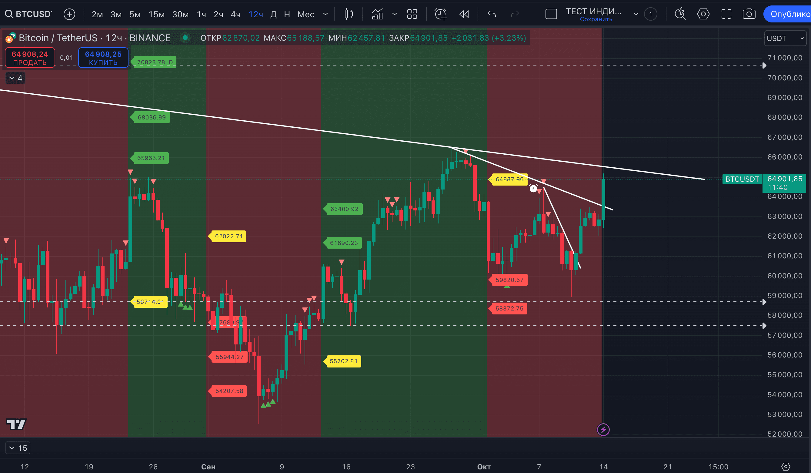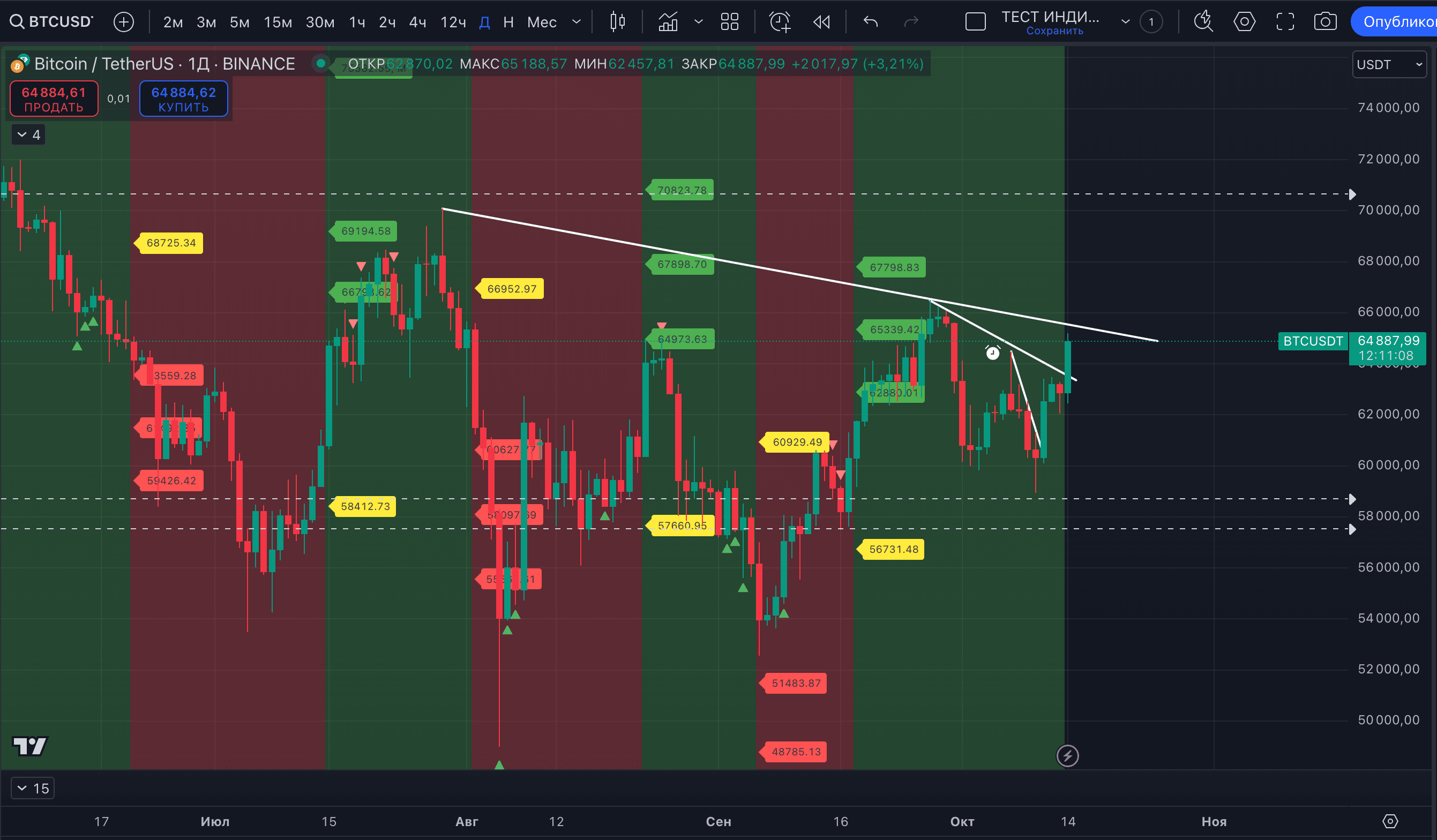 V týdenním časovém horizontu klesající trend zůstává a je příliš brzy na to říci, že se změnil. Pozornost přitahují tři vnější týdenní svíčky. Pokud tento týden uzavřeme nad 65 618 $, bude to oznámení o býčím pokračování v říjnu.