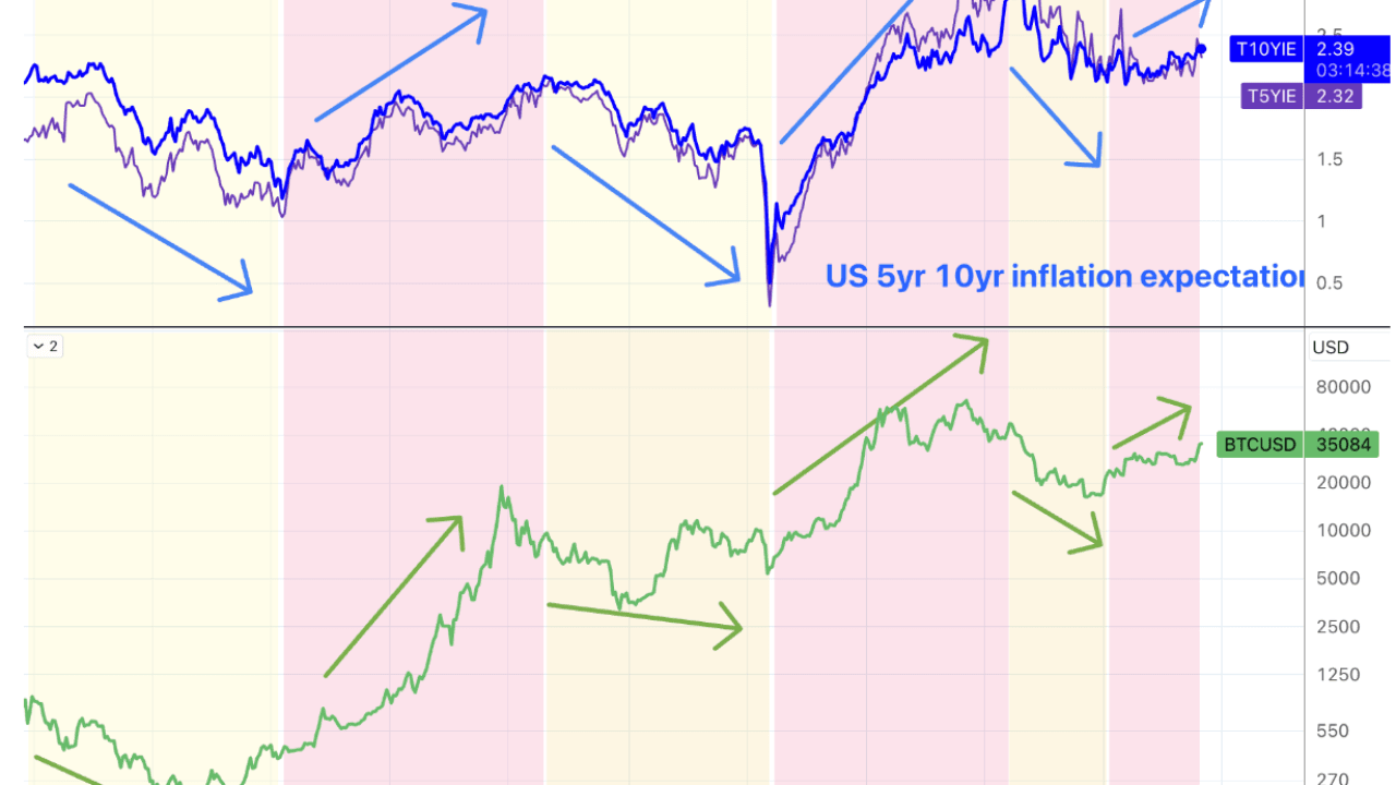 Historicky se domníváme, že alokační hodnota BTC jako alternativního aktiva je z velké části podporována stínem inflace a Medvědí trhy vždy odpovídají rostoucím a klesajícím inflačním očekáváním.