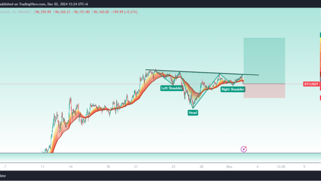 Tento graf ilustruje BTC/USDT, jak tvoří klasický inverzní hlava a ramena vzor 🟢, býčí signál obratu. Levé rameno, hlava a pravé rameno jsou jasně definovány, přičemž krční linie funguje jako rezistentní linie. Cena se blíží potenciálnímu průlomu nad tuto krční linii, což by mohlo potvrdit vzestupný trend 🚀. EMA pásmo 🟠 naznačuje silnou podporu pod cenou, což naznačuje býčí momentum. Obchodníci by měli sledovat průlom nad krční linií pro další potvrzení rally. Pokud bude úspěšné, Bitcoin by mohl pokračovat v růstu, což signalizuje silný býčí pohyb před námi. 📈✨