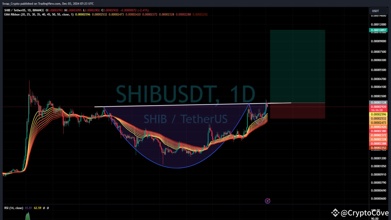 Denní graf SHIB/USDT ukazuje učebnicový vzor šálku a madla s nedávno testovaným krčkem. Průlom naznačuje silné býčí momentum podpořené rostoucími úrovněmi RSI a EMA pásem směřujícím nahoru. Pokud udržený objem potvrdí průlom, SHIB je připravena na významné zisky, cílující zónu $0.00001200. To odpovídá vaší 99% důvěře v býčí trend.