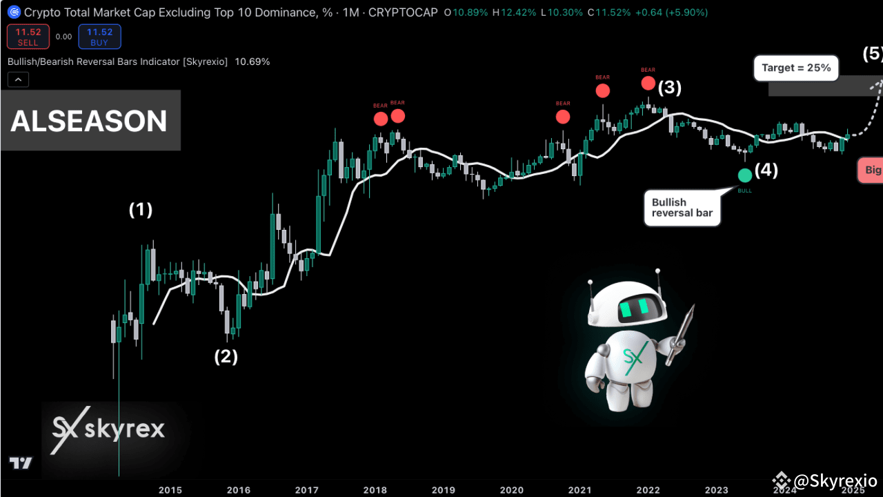 V jednom z našich předchozích článků jsme zmínili, proč je pád dominance BTC nevyhnutelný. Dnes zvažujeme tuto analýzu pomocí grafu OTHERS.D. Toto je kapitalizace všech kryptoměn, kromě top-10. Předpokládáme, že většina z vás investuje do mincí mimo první desítku pro potenciálně větší zisky. Dnes máme skvělé zprávy pro ty, kteří drží takové aktiva.