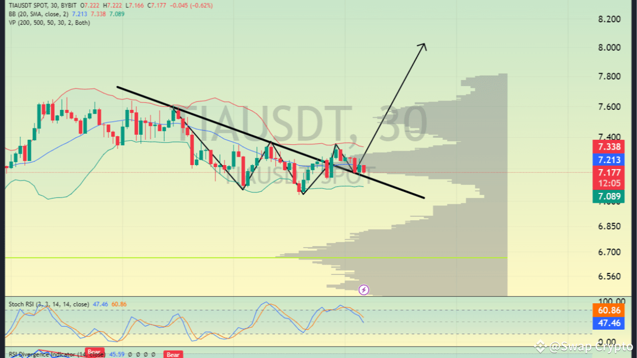 Tento TIA/USDT graf na 30minutovém časovém rámci ukazuje potenciální býčí obratu vzor. Bollingerova pásma ukazují na kompresi ceny, což naznačuje průlom. Stochastický RSI na 61,38 indikuje zlepšení momentu, zatímco indikátor RSI Divergence na 46,21 ukazuje na přechod z medvědích na býčí signály, posilující pravděpodobnost vzestupného pohybu.