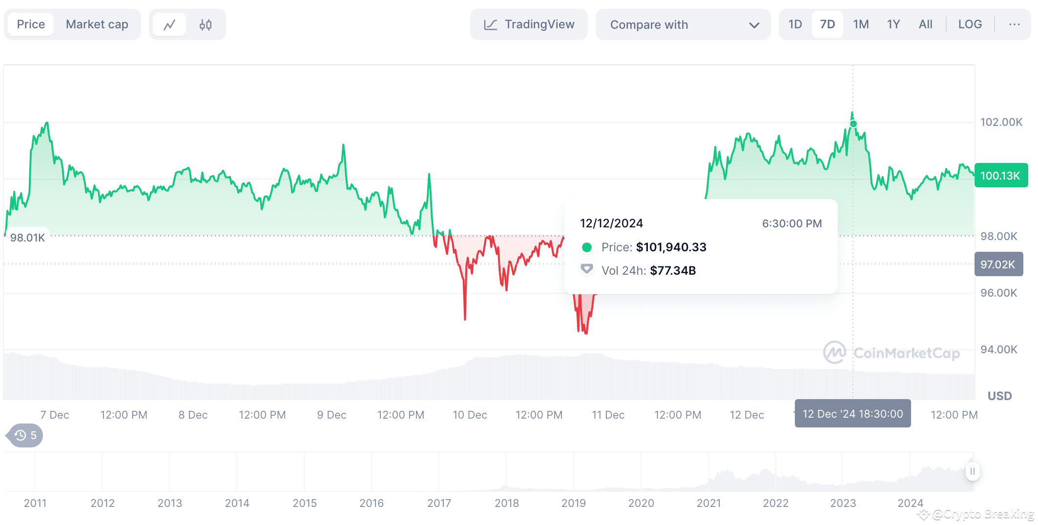 Bitcoin, který zažívá boom po volbách v USA – dosahující milníku 100 tisíc dolarů – pokračoval v růstu po včerejší oznámení o Texasově strategické bitcoinové rezervě, ačkoliv v době psaní mírně klesl.