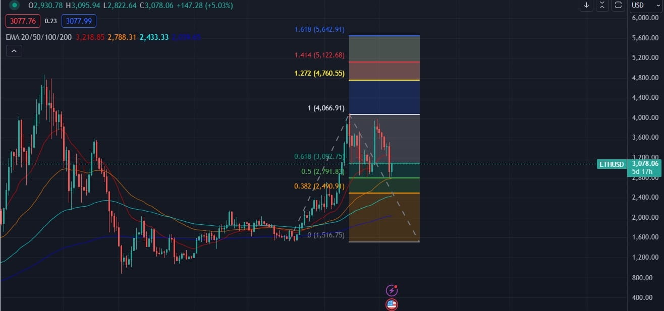 Obrázek výše ukazuje, jak tento zákon aplikujeme na Ethereum na týdenní bázi. Začali jsme od dna vytvořeného v říjnu 2023, poté od vrcholu vytvořeného v březnu a nakonec jsme se vrátili zpět ke dnu, což vedlo k výše uvedenému obrázku. Všimněte si také stejných tří důležitých bodů: 0,382, 0,5 a 0,618 a toho, jak se cena znovu objevila na přibližně 0,5, než se odrazila zpět. Pokud by tento týden došlo k týdennímu uzavření, naznačovalo by to pokračování rostoucího trendu a Ethereum by se mohlo do konce roku dostat nad 5 000 dolarů.
