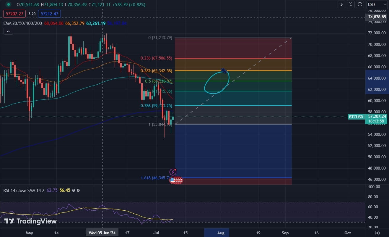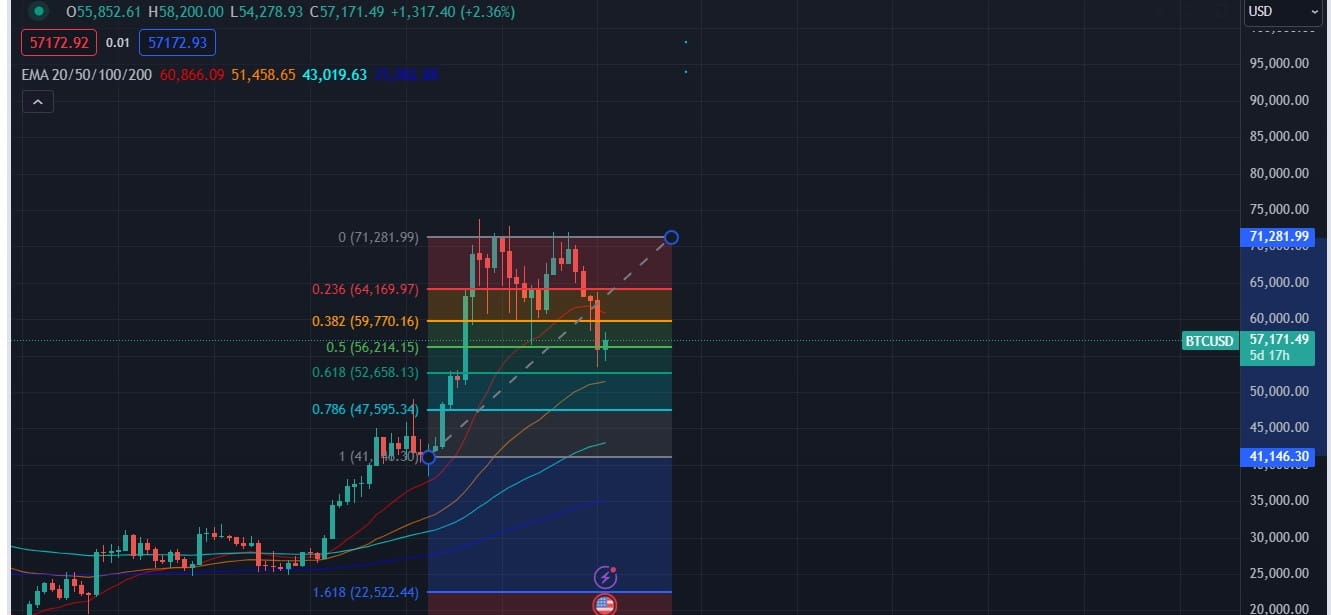 Všimněte si, jak cena Bitcoinu na týdenní úrovni zatím prolomila pouze úroveň 0,382, uzavřela pod ní, klesla pod úroveň 0,5 a poté se rychle vyšplhala nad ni. To znamená, že máte tři úrovně pro nákup Bitcoinu, abyste využili rostoucí trend: tyto tři body. Samozřejmě, pokud se úroveň 0,618 rozšíří k nákupu, je to nejlepší z hlediska výnosů, ale nejvyšší z hlediska rizika, protože cena jí nemusí dosáhnout.