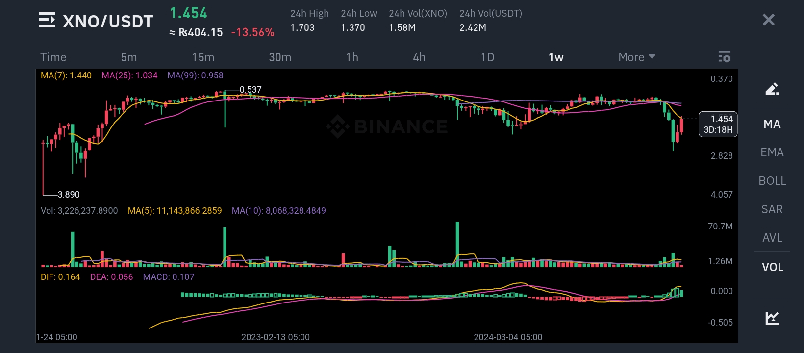 V uplynulém týdnu zažil XNO/USDT ostrý pokles, a to o 13,56 % na aktuální cenu 1,454 USDT. Tento sestupný pohyb byl doprovázen významným nárůstem obchodního objemu, což signalizuje zvýšenou tržní aktivitu pravděpodobně způsobenou panickým prodejem. Cena propadla pod klíčové pohyblivé průměry (MA7 a MA25), což posiluje medvědí sentiment v krátkodobém horizontu.
