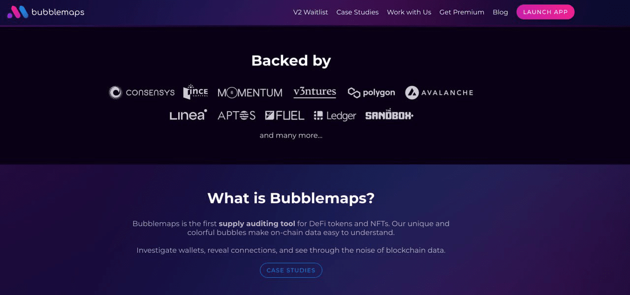 Od spuštění projektu Bubblemaps v září 2023 byla dokončena seedová investice ve výši 3,2 milionu USD. Hlavní investoři v seedovém kole zahrnují INCE Capital a také získali podporu od institucí a investorů jako Stake Capital, Momentum6, Lbank, V3ntures, Nicolas Bacca z Ledgeru, Dyma Budorin z Hackenu a francouzského krypto názoru lídra Owena "Hasheur" Simonina.