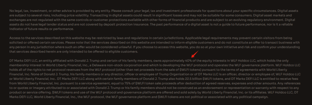 Je pozoruhodné, že podle "Zlatého papíru" projektu a zveřejněných informací na webu má rodina Trumpů nárok na 75 % čistých výnosů z prodejů tokenů (prostřednictvím následných divestit, které představují nepřímý prodej výnosů z prodeje tokenů) a 60 % budoucích čistých zisků generovaných operacemi stablecoinů.