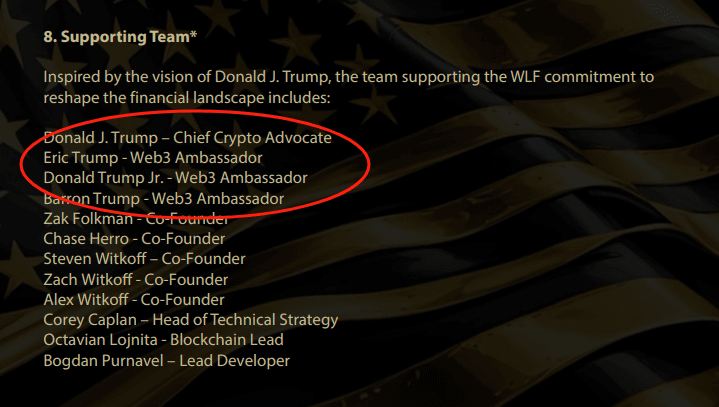 Nicméně, čtyři členové Trumpovy rodiny jsou uvedeni výše nad všemi spoluzakladateli projektu v oficiálních umístěních.