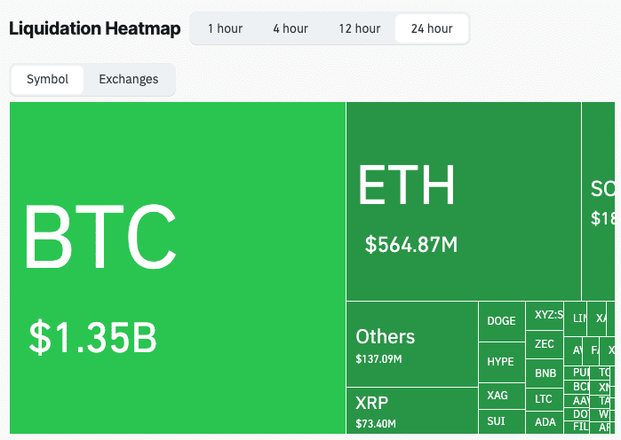 Podle údajů Coinglass vzrostly 24hodinové likvidace na trhu s kryptoměnami na 2,6 miliardy dolarů. Více než 2,17 miliardy dolarů bylo smazáno z dlouhých pozic, přičemž cena BTC sama přispěla 1,35 miliardy dolarů z toho.