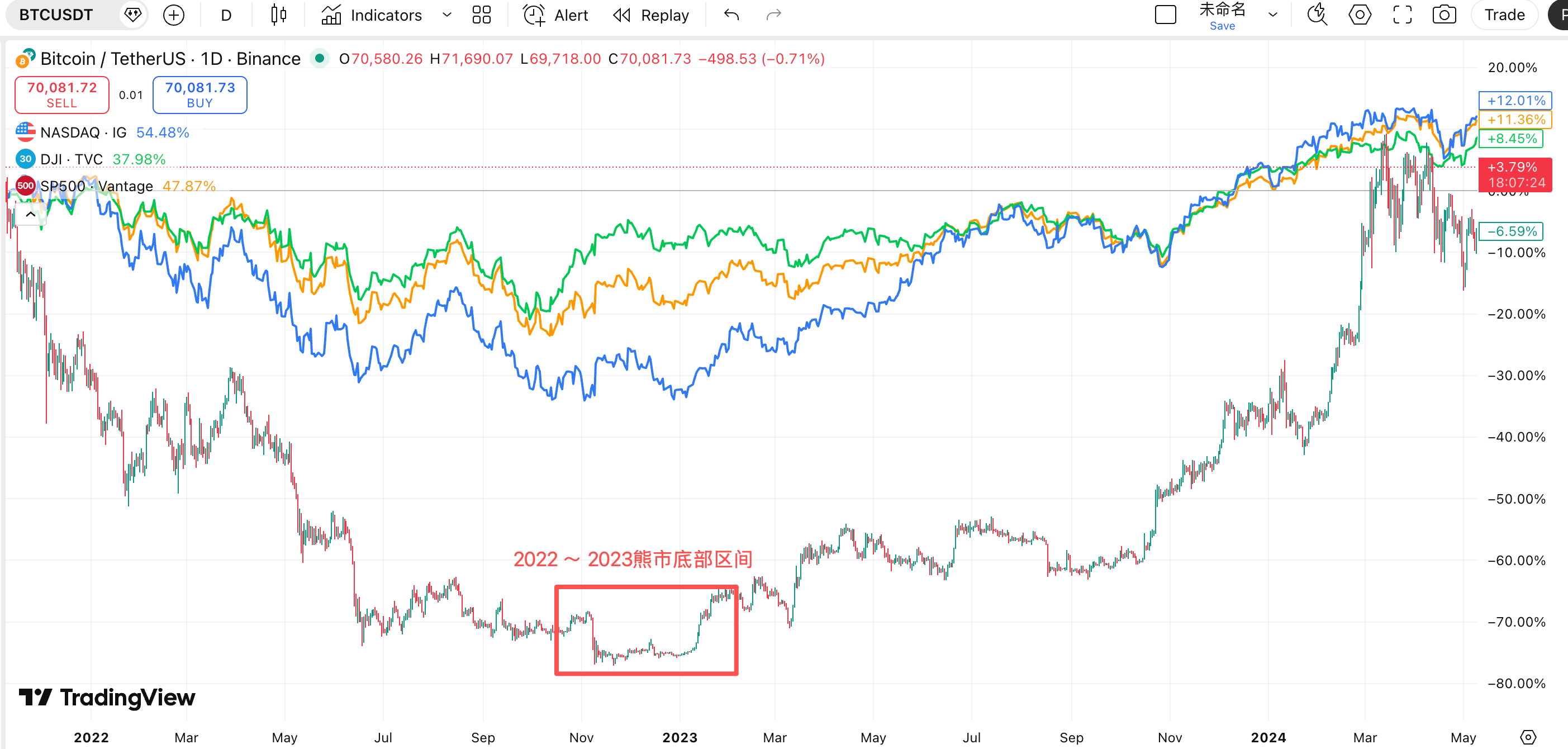 Tento obrázek ukazuje srovnání BTC po dosažení vrcholu v listopadu 2021 a vývoje tří hlavních amerických akciových indexů v následujících dvou letech. Každý může jasně vidět, že BTC po dosažení vrcholu slábne, zatímco tři hlavní americké akciové indexy se pouze pohybují v rozmezí.