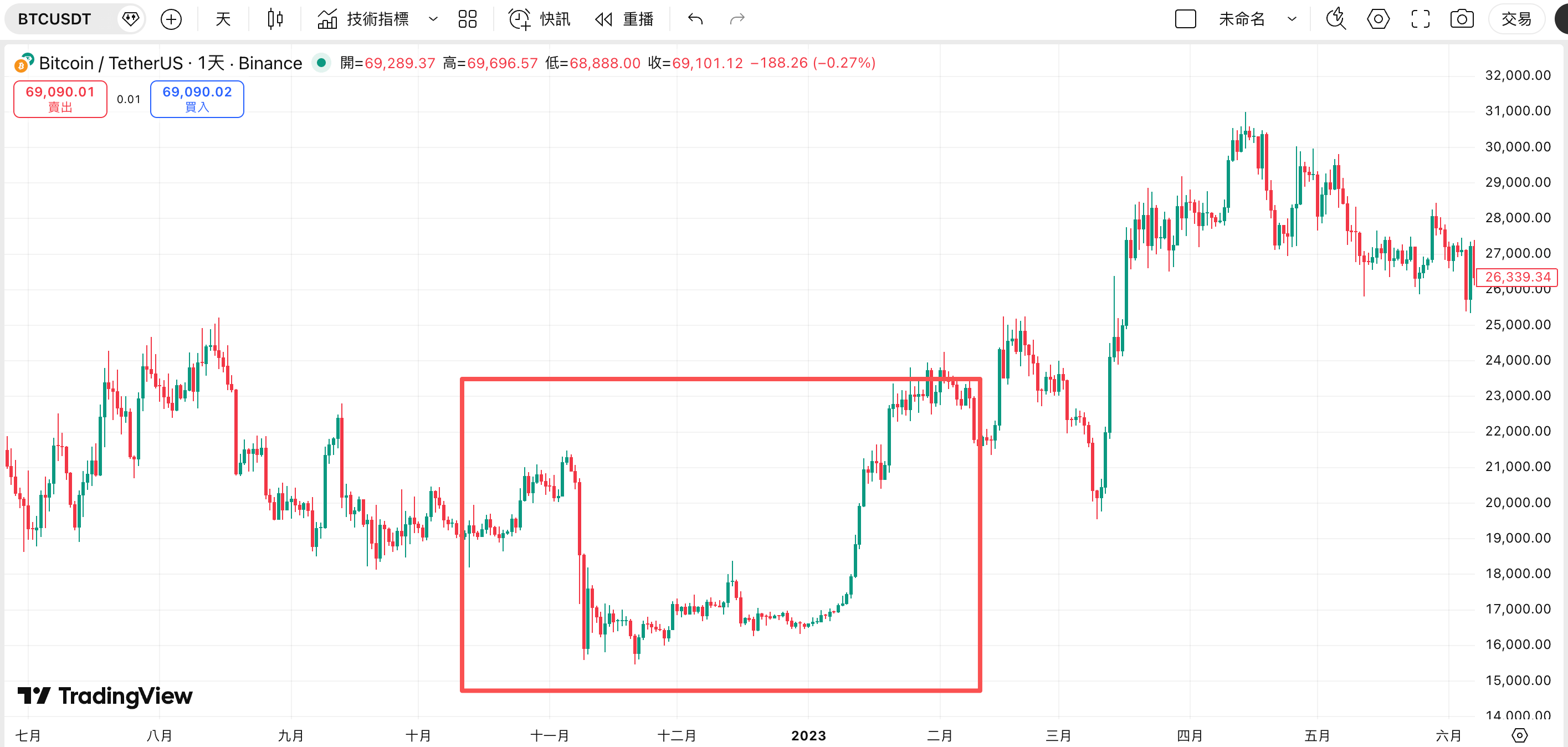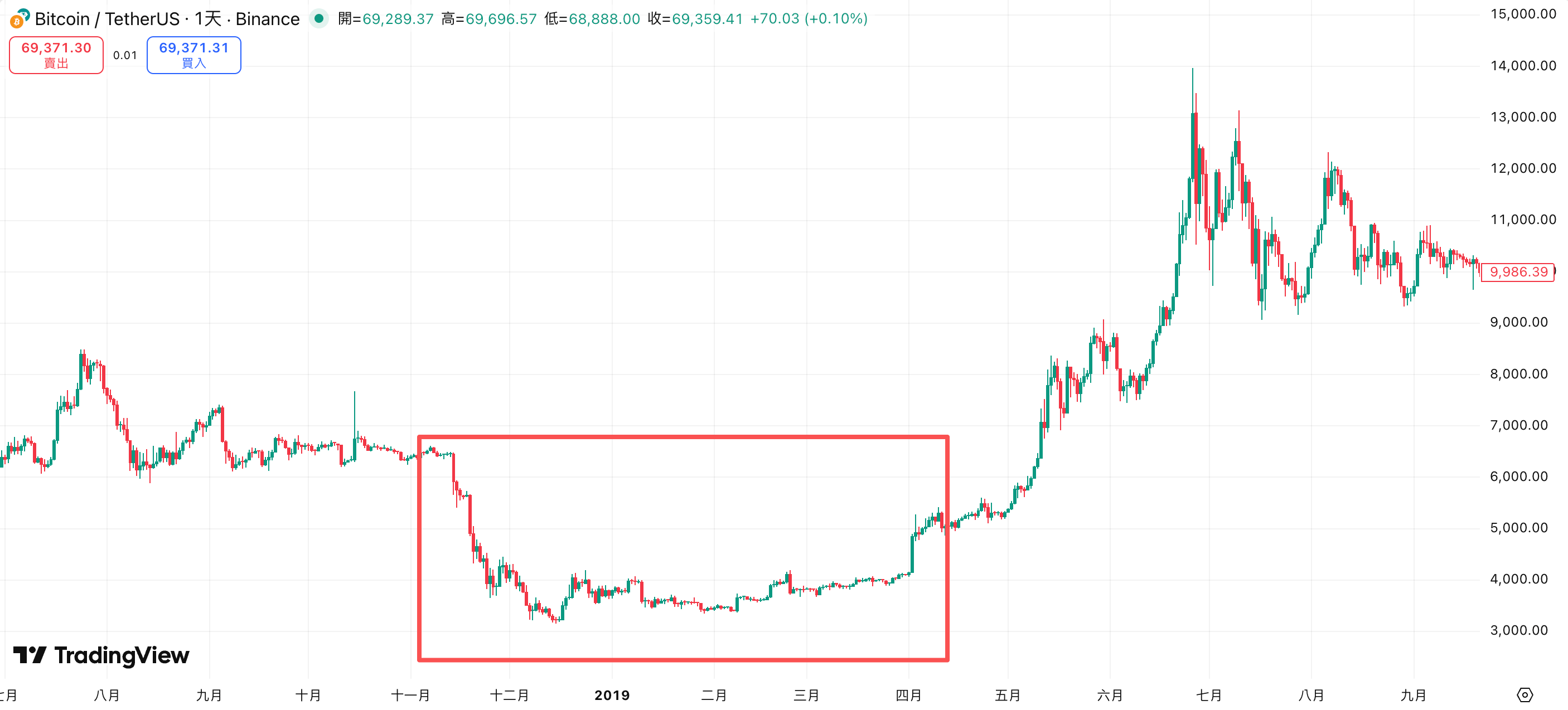 Z pohledu předchozího období, nejvyšší bod v prosinci 2017, začátek spodní úrovně byl také přibližně rok, a vyjít z této oblasti trvalo přibližně 17 měsíců.
