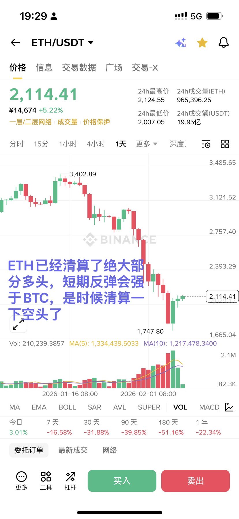 $ETH Krátkodobý odraz má silnější trend než BTC a Sol, to je normální, Yi Li Hua, když se ETH odrazilo k 2100, se většiny svých pozic zbavil. Toto ukazuje, že se objevila fáze dno, a že žádná velká short armáda nemá dostatečnou motivaci riskovat a rozprodat.