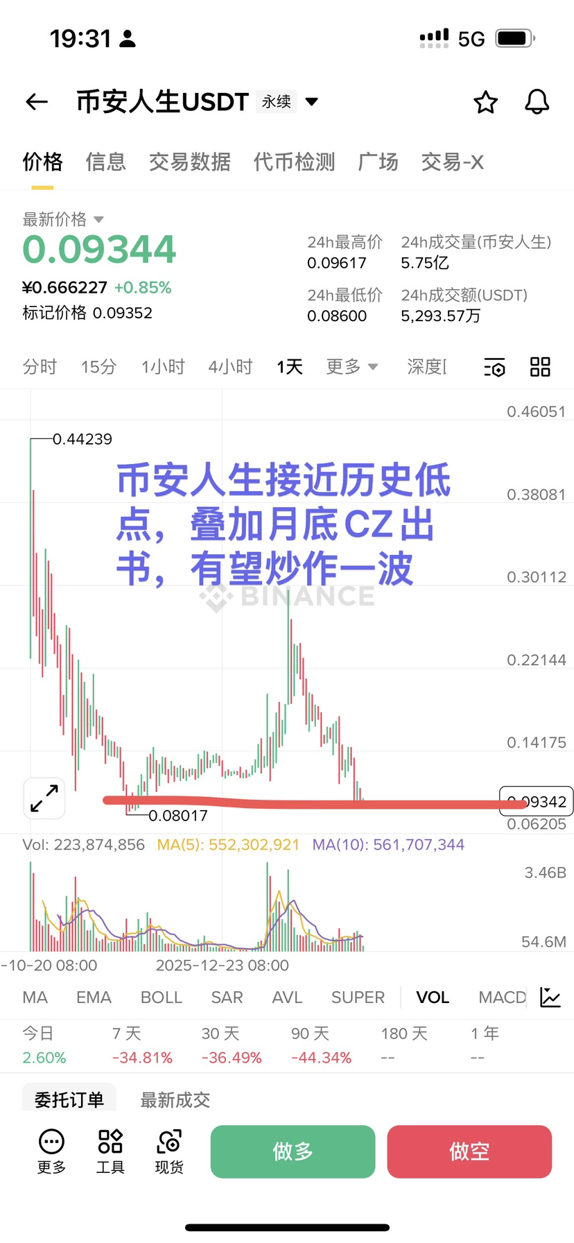 Poslední dva dny$币安人生 klesly hodně, vlastně nejenže Binance má problémy, meme coiny na BSC řetězci jsou prakticky všechny ztracené, jako například „já jsem přišel“, Hakimi a další čínské meme coiny mají také poměrně špatný trend, ale takový je medvědí trh, BTC se má také špatně, natož altcoiny, pak se mnoho lidí ptá, zda Binance ještě vzroste? Myslím, že ano, můžeme počkat do konce měsíce, kdy CZ vydá knihu, podívat se, mělo by to vyvolat nějakou spekulaci, to bude poslední příležitost k útěku, nenechte se zmást, že po nárůstu začnete fantazírovat o deseti- nebo stonásobku, to není realistické, krátkodobá podpůrná úroveň Binance je mezi 0,080 a 0,085, tento interval by měl stát za spekulaci.
