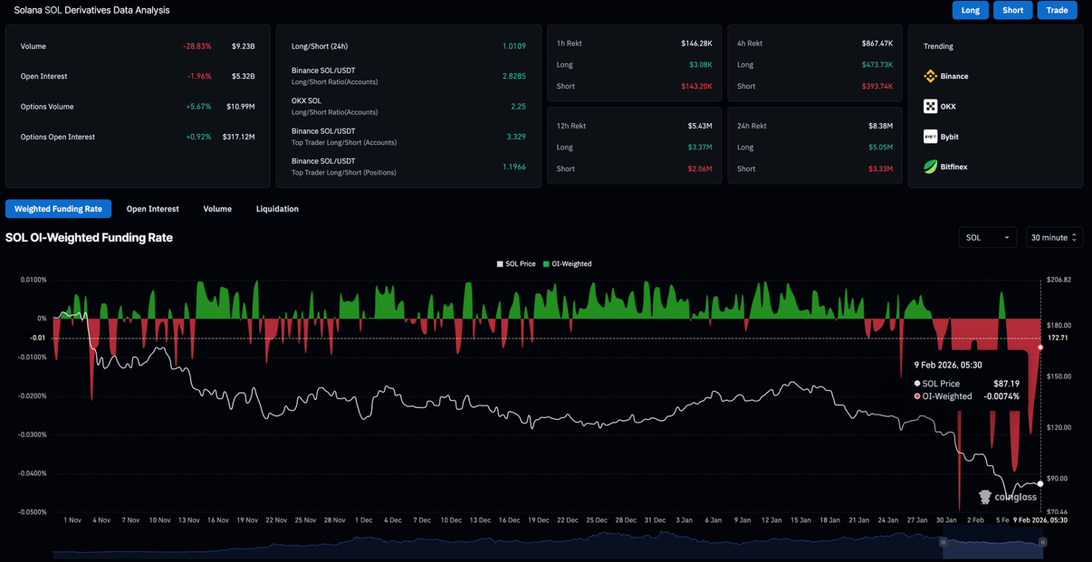 Na straně derivátů ukazují data CoinGlass, že otevřený zájem o futures kontrakty $SOL klesl přibližně o 2 % během posledních 24 hodin na 5,32 miliardy dolarů. Pokles OI naznačuje nižší expozici kapitálu, protože obchodníci přijímají přístup vyčkávání.