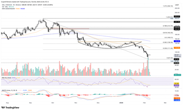 Solana ($SOL ) zůstává pod 90 dolary v okamžiku publikace v pondělí, drží se třetí den po sobě po odrazu ve výši 11 % v pátek, což snížilo ztráty minulého týdne na 14 %. První vrstva kryptoměny bojuje o udržení institucionální poptávky a segmentace poptávky v prostředí medvědího trhu s kryptoměnami, poháněném poklesem ceny bitcoinu (BTC), což zvyšuje medvědí rizika. Technický výhled pro Solanu zůstává medvědí, protože širší trh s kryptoměnami zůstává pod tlakem.