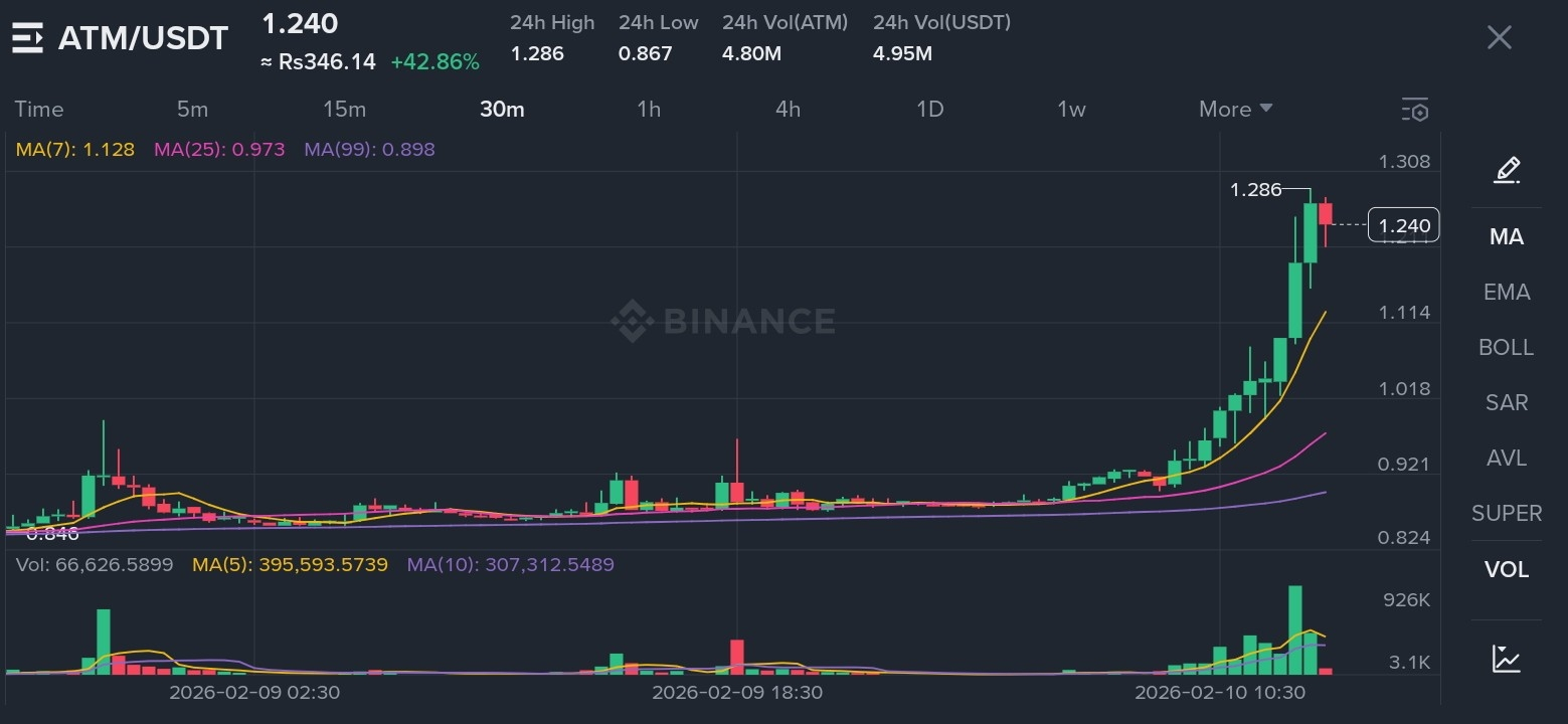 Looking at the 30-minute timeframe, the story of this pump is written in the candles. For the better part of the last 24 hours, $ATM was hugging a tight range between $0.867 and $0.921. This phase is what traders call "The Quiet Zone" or accumulation. During this time, the Moving Averages (MA) were tightly coiled, acting as a spring being compressed.
