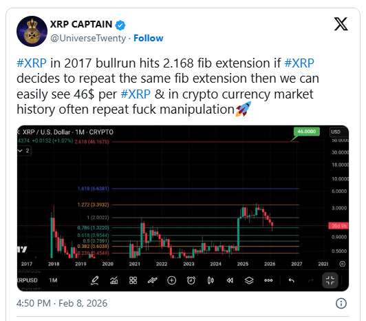 $XRP Krypto analytik XRP Captain (@UniverseTwenty) nedávno upozornil na významnou Fibonacciho expanzi na historickém grafu XRP. Podle příspěvku XRP dosáhl 2.168 Fibonacciho expanze během býčího trhu v roce 2017.