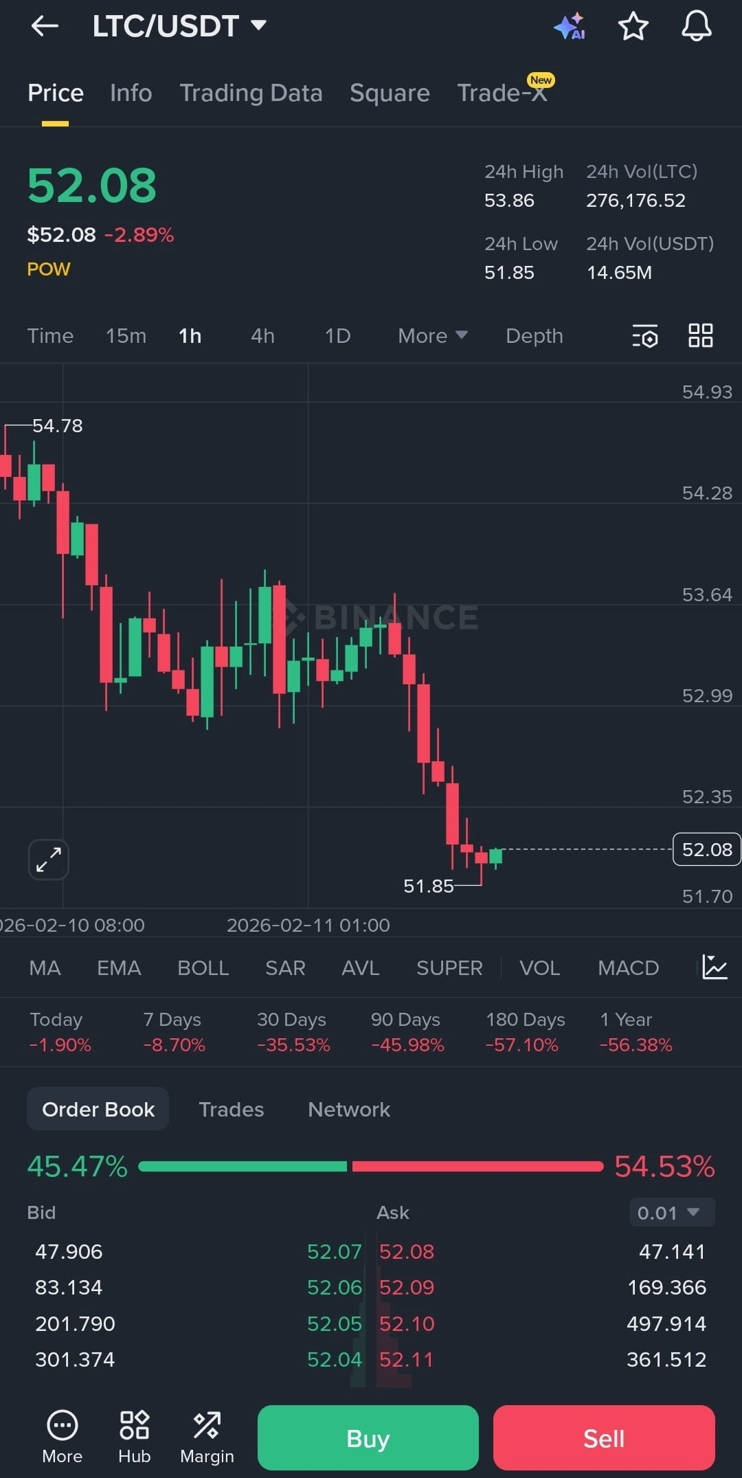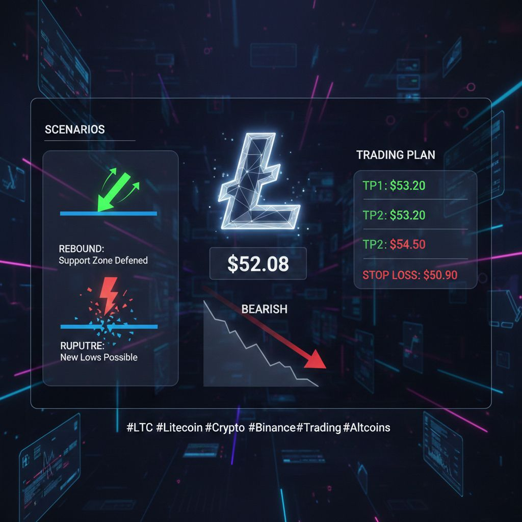 Le Litecoin (LTC) montre des signes de fatigue. Actuellement à 52,08 $, l'actif subit une pression vendeuse progressive. Les ours (sellers) gardent la main à court terme, installant une dynamique lourde sur le graphique.