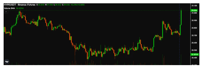 👉 Hyperliquid Strategies made a major move by allocating a big chunk of its treasury into HYPE, picking up 5 million tokens at an average price of $25.9. Even after that purchase, the firm still has $125 million sitting in cash — a clear sign it's not stretched thin. The market seemed to notice: HYPE was trading near $29 shortly after the announcement, riding a sharp upward move that suggests investors liked what they heard.