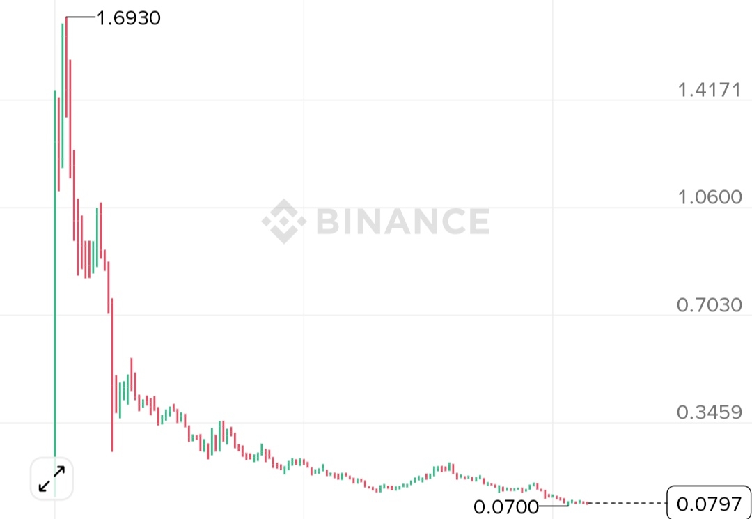 Kolaps cen: Historické maximum bylo přibližně 1,69 USD, nyní 0,08 USD, pokles přes 95 %, a pokles se nezastavil, denní, týdenní a měsíční K-line ukazuje klesající trend.