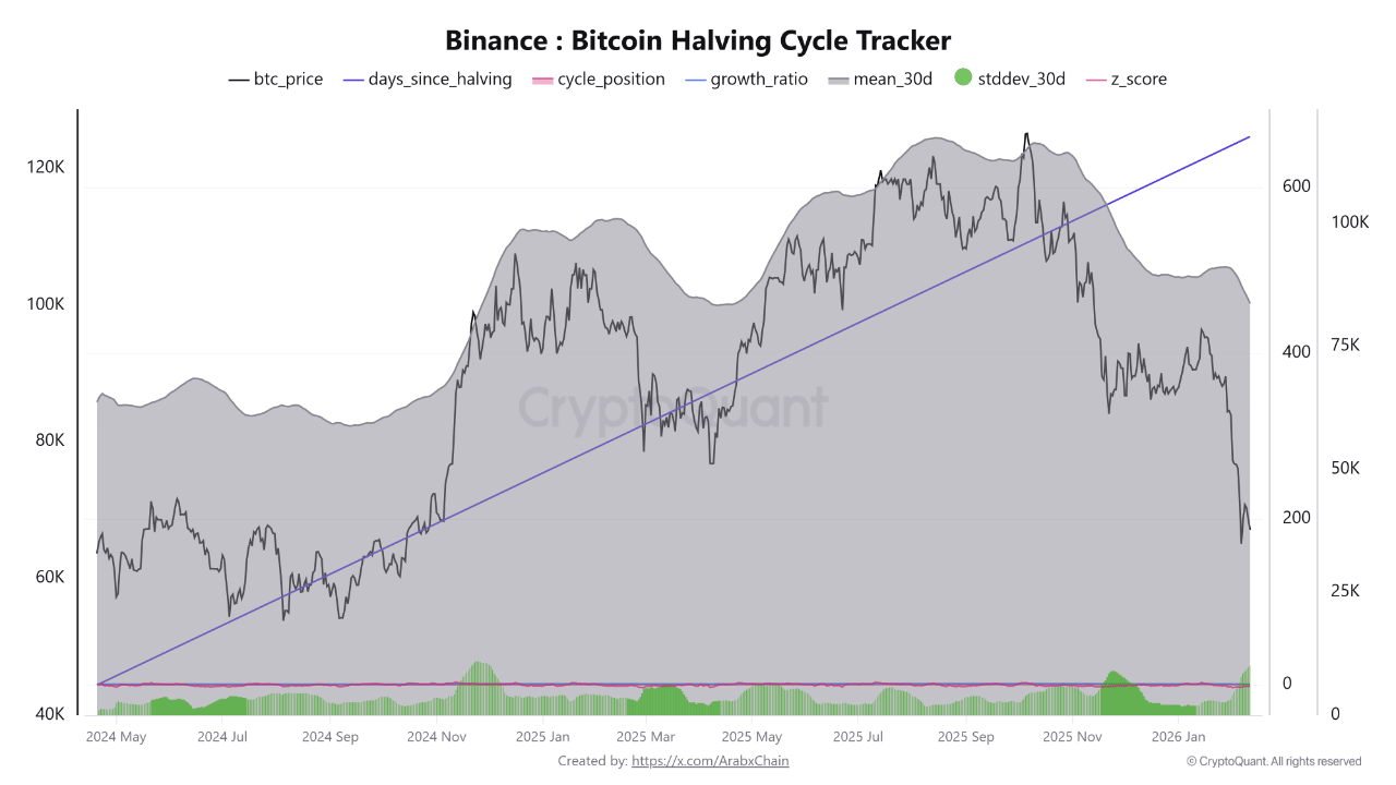 Data z Bitcoin Halving Cycle Tracker na Binance ukazuje, že trh v současnosti dosáhl přibližně 662 dní po halvingu, což je fáze, která historicky spadá kolem poloviny cyklu. To naznačuje, že trh se posunul za počátečním post-halvingovým výbuchem a začal vstupovat do fáze rovnováhy a postupného strukturálního budování.