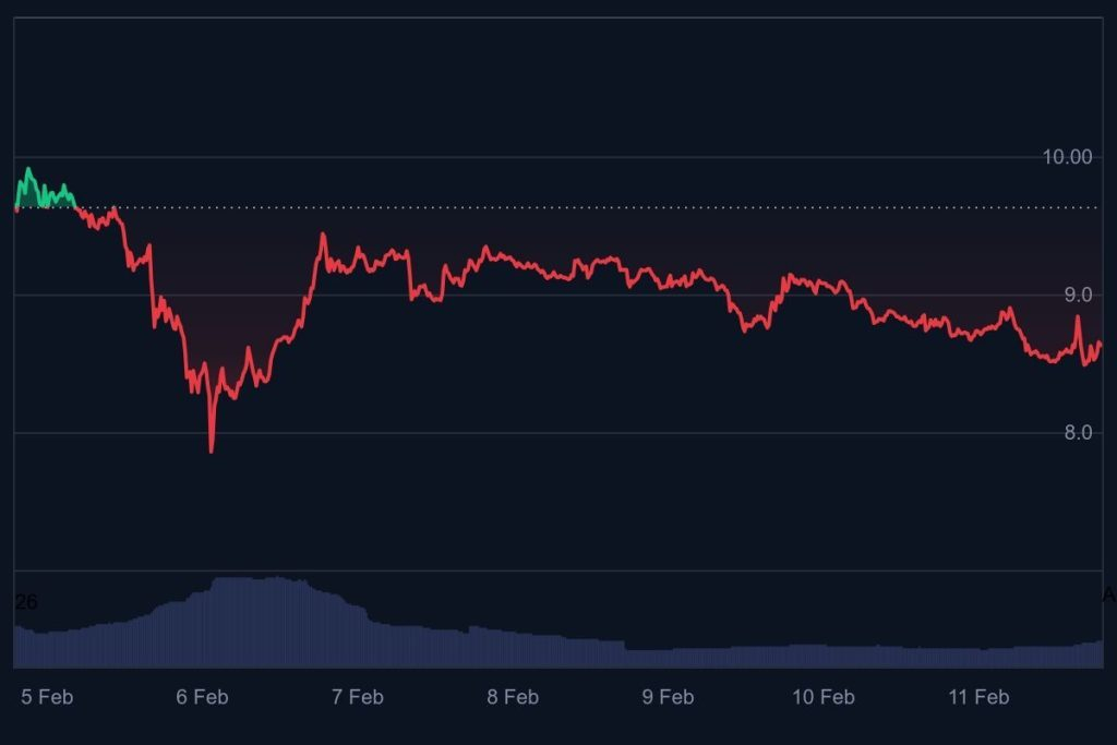 Avalanche byla minulý týden pod značným tlakem, přičemž cenová akce jasně odráží oslabení krátkodobého trendu. Po zahájení týdne 5. února, kdy se obchodovalo na 9,63 USD, AVAX klesl níže a měnil se na 8,62 USD 11. února, což představuje pokles o 11 % za toto období.